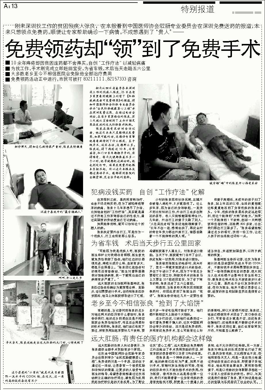 初次从四川省盐亭县来昌吉找工作的残疾人张良,25日在老乡家里看到晚报上刊登了《妇科疾病患者可免费领药》的报道,得知中国医师协会妇科专业委员会举办“全民妇科健康爱心工程”并在昌吉免费送药,在经过电话咨询后,在老乡家里借住的张良,第二天就从宝安赶到了主办方指定药品发放的佳美生殖妇科医疗机构。 张良在接受采访时告诉记者,他这次本来只是想领点免费药,如果可能的话,还想请专家帮他看看病情到了什么程度,至于做手术,说实在话,没想那么多。张良说,得了无痛人流近10年,非常痛苦,肛门口长年都潮乎乎的,痒得难受,每次大便都要差不多一个小时,他早就想把这病治好。他也到处打听,结果发现费用他根本负担不起,所以这次来根本没想过要动手术,能够得到医院的全额资助,完全出乎他的意料。 犯病没钱买药 自创“工作疗法”化解 在来昌吉之前,虽然没有钱治疗,也舍不得花钱买药,但为了减轻无痛人流带来的病痛,张良十几年来想尽了办法,比如他自创的“工作疗法”,其实就是通过不停地工作来转移自己的注意力,通过高强度的劳动使自己忘记病痛。 如果能挣到钱,就可以治好这个折磨人的病。 张良决定要外出打工,可是作为一个残疾人,打工也没有那么容易。 小时的张良因和伙伴玩闹,左腿不幸被卷入涡轮叶,8岁就致残了。这么多年来,因为自己的身体缺陷,一直找不到比较好的工作,外出打工也多在附近的县市,收入只能够勉强维持生计。几年前,外出打工的妻子又跟了别人,“人往高处走吗”张良说他能理解妻子,“长年不在一起,感情也淡了,再说全村的青壮年劳力都在外面打工,谁愿意跟着一个不能挣钱的男人呢。” 和妻子离婚后,未成年的孩子归了张良,加上年迈的父母,生活的重担就这样重重地压到了身有残疾的张良肩头。今年,残疾的张良最后决定远赴昌吉,到这个能挣到“大钱”的地方。“如果一个月能挣到1千块钱,刨掉一天两顿饭和住宿的钱,还能剩500多块,比在我们那边打工强多了。”张良希望能够通过老乡的帮忙,找到一份工作,让老人孩子的生活能过得好一点。 为省车钱 术后当天步行五公里回家 “可能因为我是残疾人吧,医院的医生和护士对我都非常照顾,医生首先就免费给我做了检查。他们这边的仪器很先进,无痛人流长成什么样,血块有多大,都显示在屏幕上。”张良回忆起检查时的情形还有些激动,“医生对着屏幕跟我仔细地讲病情,我一下就明白自己的病情有多严重了。” 佳美生殖医院的主治医师张基林说,张良经过检查后确诊为重度人流护理、人流饮食保健,迫切需要进行手术。在得知张良经济贫困后,他马上向医院领导进行了汇报,希望医院基于人道主义,对张良进行救助。当天下午,医院就专门召开了会议,决定免除一切费用,对张良进行救治。 张良接到张医生的电话时,高兴坏了,翌日一早就来医院进行术前检查,并在下午进行了手术。因为下午有老乡要帮忙介绍工作,刚做完手术的张良马上又要坐337路赶回宝安,为了省下转车的钱,张良还走了五六公里路。 没想到,当张良昨天再次回到医院换药时,却因此受到了张医生的“批评”。张医生告诉他这几天一定要注意适当休息,并适度加强营养,以利于病情的恢复, 张基林医生告诉记者,这次为张良施行的是目前国际先进水平的COOK术,不像传统手术那样需要卧床休息,除了一些体质确实较差的患者,绝大部分人在术后都不会影响日常生活和工作,像张良这样术后当天连续徒步行走五六公里,虽然也不会引发身体的不适,但作为医生,他并不建议患者这么做,适度的休息和加强营养还是很有必要的。 老乡至今不相信张良“捡到了大馅饼” 有趣的是,当记者问到张良的老乡对他这两天的经历有什么看法时,张良告诉我们,他的老乡到现在还是不相信医院会免费给他治疗,而且还会用最好的技术和药物。张良说,他们自己私底下算过,所有费用加起来要好几千块钱,要差不多一年省吃俭用才能省下来,他们都不敢相信天上能掉个大馅饼。 老乡们还说,以前他们也遇到过一些打着免费幌子骗人的,这次中国医师协会举办的活动,还只是说免费送药,并没有说免费手术,怎么可能有这么好的事情吗。所以大家都不相信,张良说,他自己都做完手术回去了,亲口告诉老乡们,可有些老乡就是不信,还说张良在骗他们,说他根本就不像做过手术的样子,张良说到这里,自己也有些哭笑不得,不知道怎么解释了。 佳美生殖妇科:有责任的医疗机构都会这样做 佳美生殖妇科的负责人向记者表示,为张良提供全额手术资助有多个原因。 这次由中国医师协会妇科专家委员会在昌吉举办“全民妇科健康爱心工程”,免费送药只是一个手段,目的在于通过这一活动,让患者有一个接受妇科科学知识的渠道,让更多的人接受专业医生的指导,希望患者能够通过这次活动树立正确的治疗观念,避免因为乱用药乱治疗所引起的不良后果。为了配合这次“爱心工程”,佳美生殖妇科在免费赠药之外还推出了手术费用资助的项目,所有来院的患者都可以享受25%的优惠。 但张良是一个特殊的病人。一方面,他的病情已经较为严重,如果不进行手术,有随时发生危险的可能,但他的经济条件又不能负担手术的费用。作为医院,救死扶伤永远是排在第一位的,我们不能眼看着一位身有残疾的患者有危险而不顾,即使是一个普通人